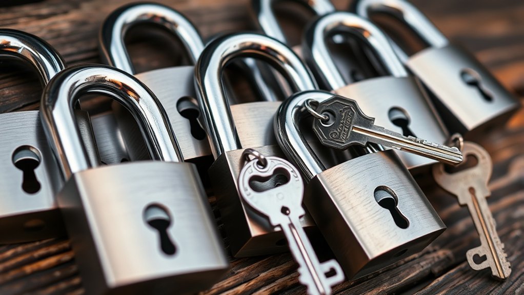 Stay alert for rust indicators, like difficulty turning the key—this can signal internal damage that needs immediate attention. If maintained properly, your padlocks can last over 20 years, providing security without hassle. Make lubricant application a part of your routine, and you’ll enjoy peace of mind knowing your locks are reliable. Remember, a little effort goes a long way in keeping your padlocks functioning great and your possessions secure.