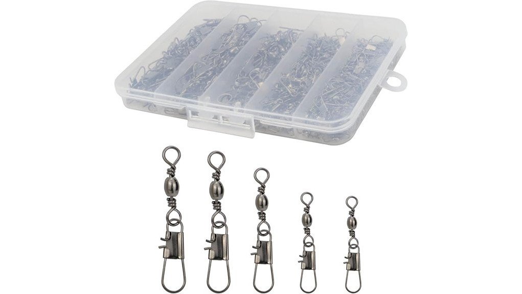 The sizes allow for targeting different species, from panfish to catfish. Additionally, the swivels come in a compact divided plastic box, measuring 5.8x4x0.6 inches, promoting easy storage and accessibility.