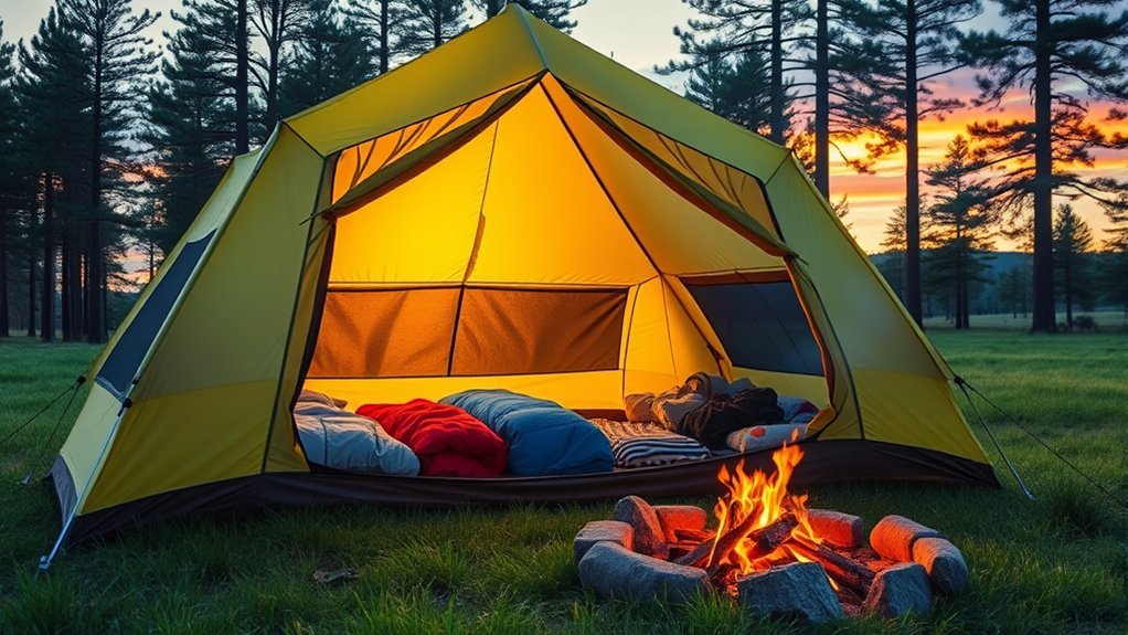 While planning your camping trip, you’ll want to evaluate additional storage options in a 10-person tent to keep your gear organized and accessible. Look for tents with storage pockets and gear lofts to help manage smaller items and reduce clutter. A tent with a room divider can also separate personal gear from living or sleeping areas, enhancing organization. Choosing a tent with a central living area creates more space for gear storage and family activities. Some tents even include mesh storage pockets, making it easy to grab essentials when you need them. Finally, ascertain the tent design allows for easy entry and exit, facilitating the movement of larger items like air mattresses without sacrificing storage space.