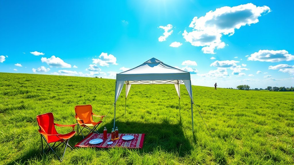 A 10×10 pop-up tent offers a generous 100 square feet of shaded space, easily accommodating 6 to 10 people for your events. With an interior height exceeding 9 feet, you’ll enjoy ample headroom, making it comfortable to stand and move around. Many models feature adjustable height settings, allowing you to customize the peak height between 8.5 to over 9 feet, ensuring it fits your needs. If you’re planning to include tables and chairs, a 10×10 tent can typically accommodate these while still leaving enough walking space for your guests. Additionally, adding sidewalls, whether included or purchased separately, can enhance privacy and protection from the elements, making your gathering more enjoyable.