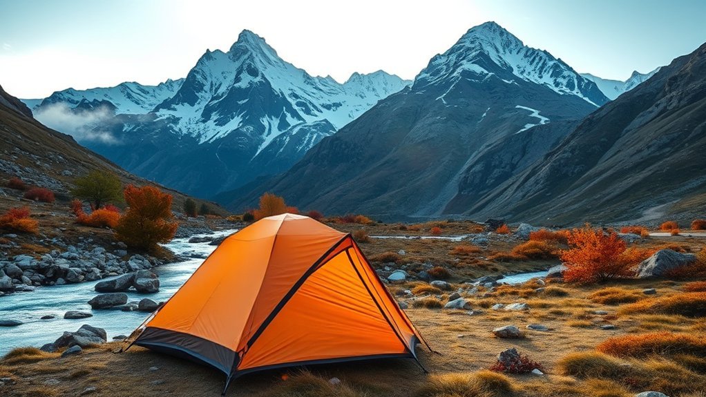 Choosing a 4-season tent goes beyond just considering ventilation features. You need a tent that can handle heavy rain, snow, and strong winds, typically requiring a waterproof rating of at least 3000 mm. The material matters, too; durable fabrics like nylon and polyester provide insulation in winter while allowing breathability in summer. Look for features like snow skirts and double-layer designs to enhance insulation and minimize heat loss. A tent that’s easy to set up is essential, especially in unpredictable weather—aim for one that you can pitch solo in minutes. Finally, make sure it has adequate ventilation systems, such as mesh windows and vents, to keep condensation at bay and maintain comfort no matter the season.