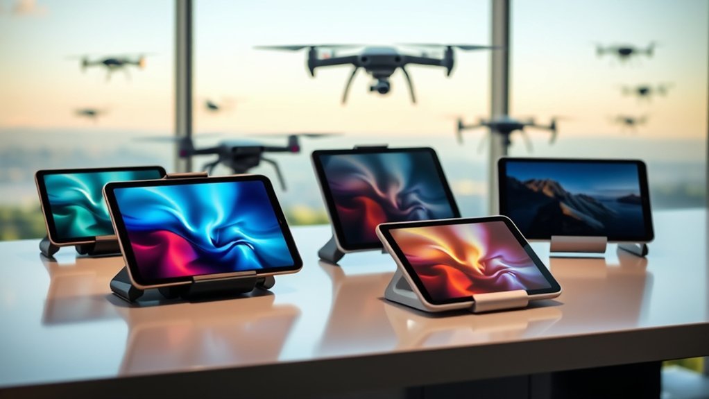 In 2026, you’ll want reliable tablet holders to enhance your drone flying experience. Consider the Hanatora Tablet Holder Mount, designed for DJI Mavic controllers, or the versatile Remote Control Tablet Mount that works with multiple drone models. The Sunliang Tablet Mount and FPV Remote Controller Holder are also excellent choices for stability and adjustability. Each offers easy installation, portability, and compatibility with various devices. Stick around to explore more options that every pilot needs!