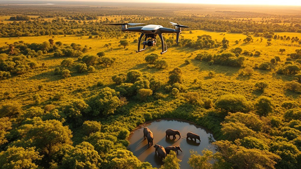 Choosing a drone with excellent camera quality is essential for capturing stunning wildlife photos. Higher resolution cameras, like 4K, deliver sharper images and reveal intricate animal features in their natural habitats. Look for high-quality lenses with adjustable angles, such as 90° or wider, to effectively frame your shots from different perspectives. Stabilization features, like 3-axis gimbals or electronic image stabilization, minimize jitter, resulting in smoother footage and clearer images during flight. Advanced imaging technologies, including HDR and low-light performance, enhance your ability to shoot in varying lighting conditions, ensuring detailed captures in both bright and shadowed areas. Finally, real-time transmission capabilities let you monitor the camera’s view, allowing precise framing while keeping a safe distance from wildlife.