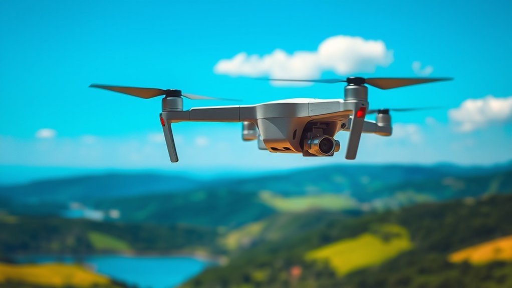Safety features are essential to evaluate as you explore drones under 250g, especially if you’re a beginner. These lightweight drones typically don’t require FAA registration, making them accessible for casual users. Look for models with GPS functions, which offer Smart Return to Home features, automatically guiding the drone back if the battery’s low or the signal’s lost. Altitude and distance limits help prevent loss of control, ensuring safer operation for novice pilots. Low battery warnings are another vital feature, alerting you to return the drone before it runs out of power. Additionally, advanced stabilization systems, like 3-axis gimbals, enhance flight safety by providing smooth video capture and reducing accident risks during turbulent conditions.