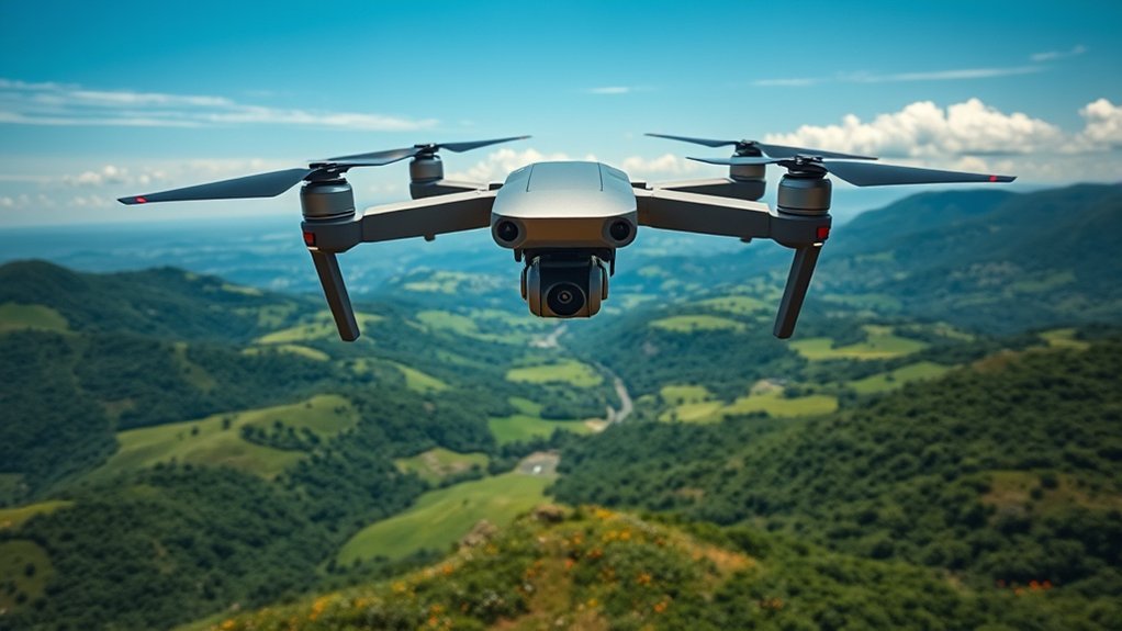 When you’re capturing stunning aerial shots with a drone equipped with a zoom camera, the choice of stabilization technology can make all the difference. Look for drones featuring 3-axis gimbal systems, which greatly reduce image shaking and enhance video smoothness, especially during dynamic movements or windy conditions. High-Precision FOC Motor Control in gimbals guarantees your camera maintains a stable position, resulting in clearer, more professional-looking footage. Advanced methods automatically adjust camera positioning, focusing on your subject while minimizing vibrations. Don’t overlook Electronic Image Stabilization (EIS), which helps reduce the impact of small shakes and jerks, guaranteeing a smoother viewing experience. Effective stabilization directly influences the quality of your aerial photography, particularly when utilizing zoom capabilities.