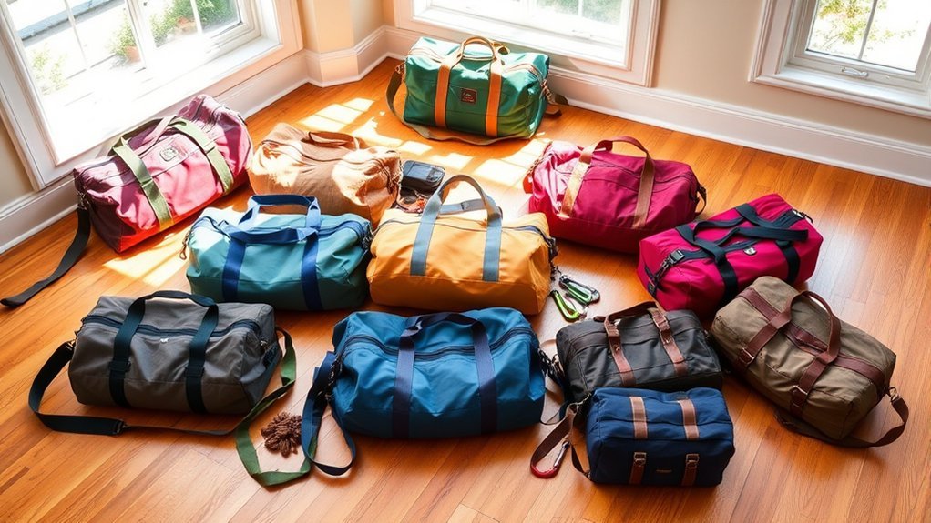 When selecting a duffel bag for your equipment, comfort during transport should be a top priority. Look for bags with extra wide padded shoulder straps, as they make carrying heavy gear much more comfortable. Multiple carrying options, like double handles and detachable shoulder straps, give you versatility in how you transport your equipment. Verify the bag’s design allows for even weight distribution to reduce strain on your body and prevent sagging. Reinforced stitching at the handles enhances durability, so you can carry heavier loads without discomfort. Additionally, opt for ergonomic features like side handles and padded grips, which can appreciably improve your carrying experience. Prioritizing these aspects will make your travels with equipment much easier.