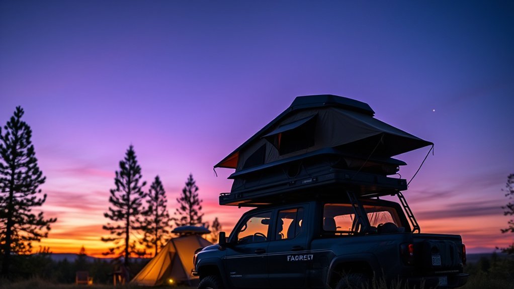 While evaluating hardshell rooftop tents, the included accessories can greatly enhance your camping experience. Many models come with a telescoping ladder, typically around 7.5 feet long, making it easy to climb in and out. Internal storage bags, shoe organizers, and mesh windows can help keep your space organized and convenient. Built-in LED strip lights provide essential nighttime illumination, adding comfort to your trips. You’ll also appreciate features like condensation pads and anti-condensation mats that help manage moisture and improve your sleep quality. Plus, USB outlets for charging devices and crossbars for mounting extra gear can elevate your overall experience. Choosing a tent with these accessories can make your adventures more enjoyable and hassle-free.