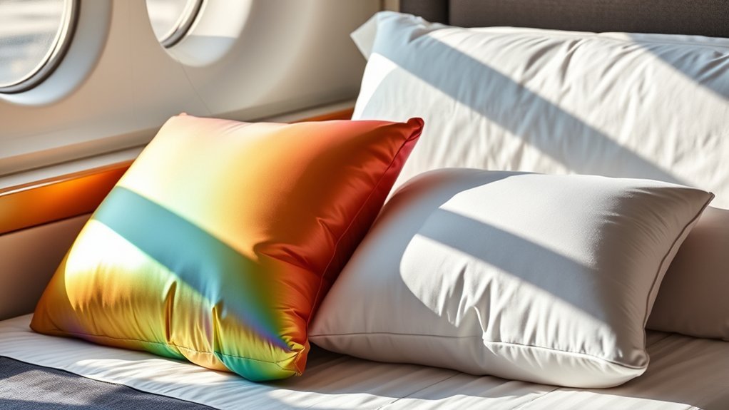 While both inflatable and memory foam travel pillows have their unique advantages, their versatility in use can greatly impact your travel experience. Inflatable pillows are often more adaptable, allowing you to adjust the firmness and pack them down to a compact size, making them ideal for various travel scenarios. They’re perfect for outdoor activities like camping or hiking. On the other hand, memory foam pillows deliver consistent support and comfort, molding to your neck and head for long journeys, but they’re bulkier and better suited for stationary use. If you need a pillow for diverse applications, such as lumbar support or neck alignment in different environments, inflatable options are likely more versatile than traditional memory foam variants.