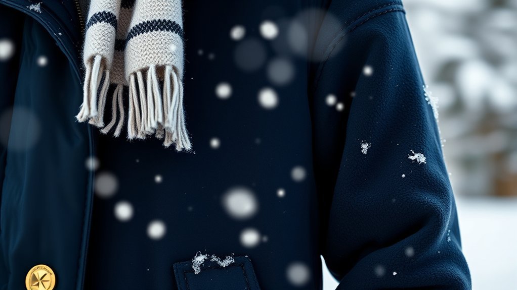 Fabric quality is a key factor that can make or break your winter jacket experience. When choosing a Michael Kors winter jacket, consider how the fabric impacts insulation, breathability, and comfort. High-quality options often feature down insulation or synthetic materials that keep you warm without excessive bulk. Look for durable, weather-resistant fabrics like nylon or polyester, which shield you from wind, rain, and snow. The finish—whether glossy or matte—affects both the jacket’s aesthetic and its water-repellent properties. Remember to follow proper care instructions to maintain the jacket’s integrity and guarantee its longevity, especially in harsh winter conditions. Investing in a well-crafted jacket will enhance your winter wardrobe and keep you cozy throughout the season.