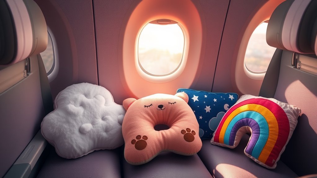 Selecting the right pillow for your toddler’s air travel is essential for their comfort and safety. Make certain the pillow is specifically designed for toddlers, typically for ages 2 and up, to provide adequate support. Opt for hypoallergenic materials to prevent allergic reactions, as toddlers often have sensitive skin. The pillow should have dimensions suitable for their size, guaranteeing a comfortable fit. Safety is paramount—avoid pillows with small parts that can be choking hazards, and choose ones that are securely stitched. Finally, a lightweight and compact design is ideal for travel, making it easy to pack without adding unnecessary weight to your toddler’s luggage. Prioritizing these factors helps ensure a safe and pleasant journey for your little one.