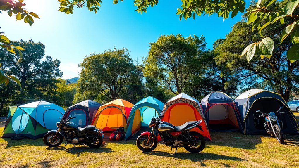 When you’re looking for the best tents for motorcycle camping, consider lightweight options like the OneTigris Backwoods Bungalow, which weighs only 3.2 lbs and offers great weather protection. The Night Cat Upgraded Tent is another solid choice with its quick setup and ample space. Don’t miss the Harley-Davidson Dome Tent if you need extra storage for your bike. To find more top choices and features, keep exploring this list.