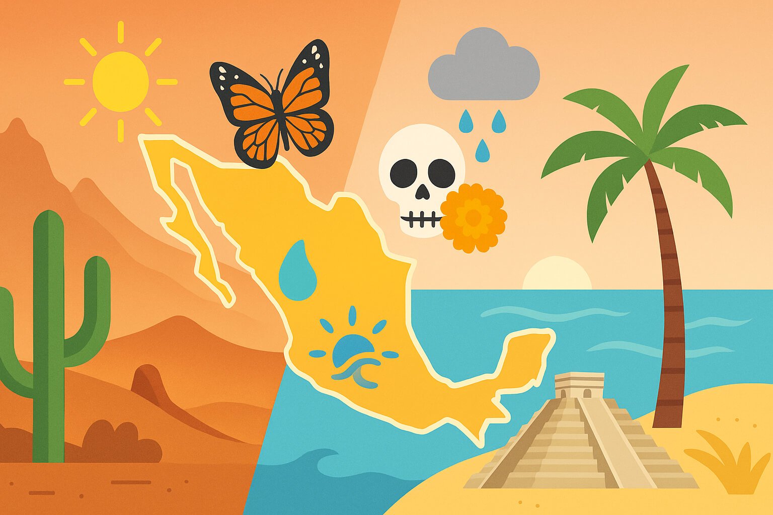 Mexico’s climate is as diverse as its geography, which ranges from arid deserts to lush rainforests and temperate highlands. The country experiences a variety of climatic zones, influenced by factors such as altitude, latitude, and proximity to the ocean. Generally, Mexico can be divided into two main seasons: the dry season, which typically runs from November to April, and the rainy season, which spans roughly June to October (timing varies by region) (source).
