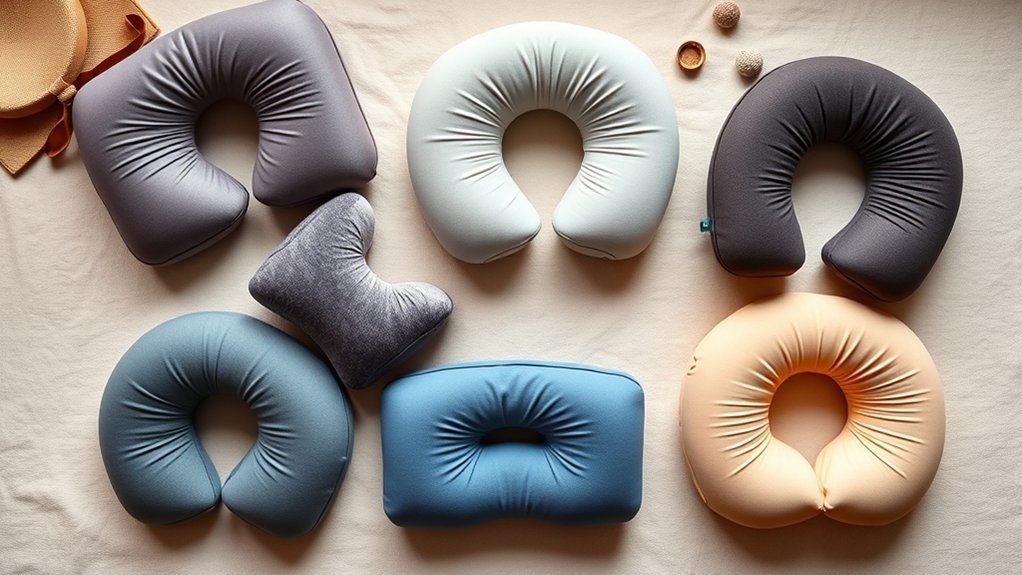 You should avoid travel pillows made from materials like memory foam or polyester, as they can irritate sensitive skin. Opt for breathable, hypoallergenic fabrics to guarantee comfort and support your healing process effectively.