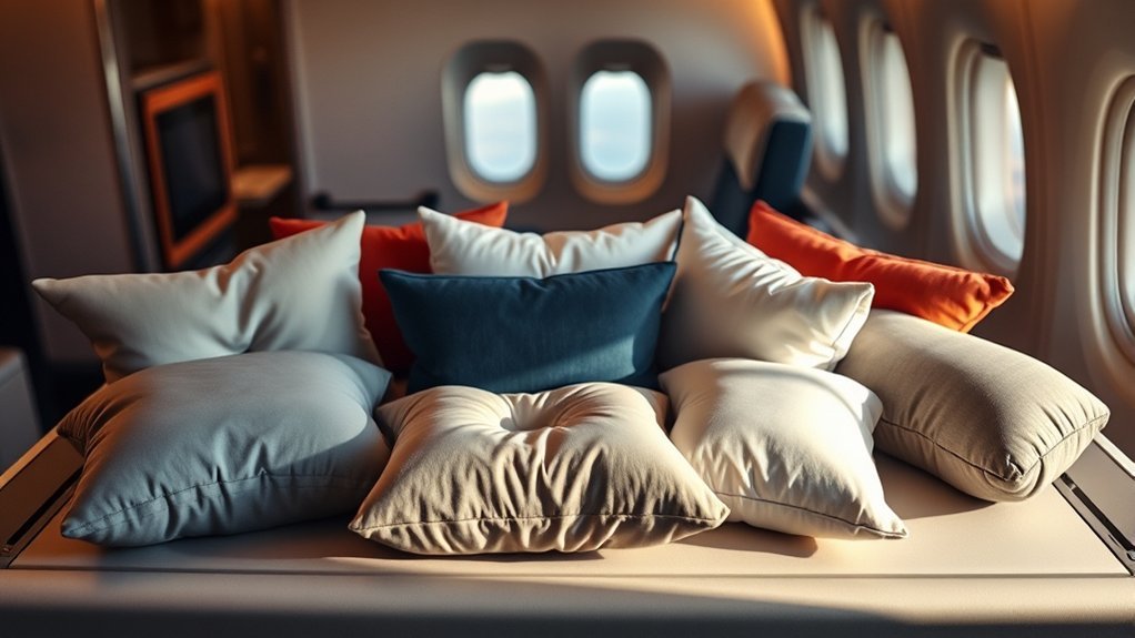 When choosing the best travel pillow for your tray table, consider options like the Luxury Memory Foam Travel Neck Pillow and the Inflatable Travel Air Pillow, both designed for maximum comfort. The TRAVELREST Nest Neck Support Pillow offers excellent neck support, while the Sunany Inflatable Travel Pillow comes with eye masks and earplugs for added relaxation. Lightweight and portable designs make it easy to carry. If you want to explore more choices, check out our complete list of top picks.