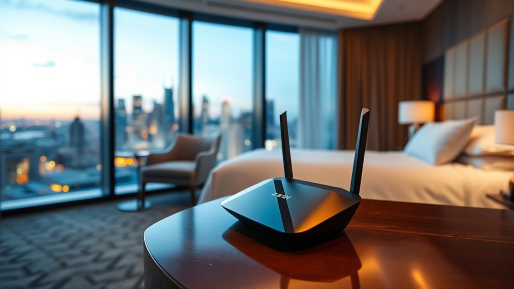Choosing the right travel router involves considering several power options that can enhance your hotel stay experience. Many travel routers offer flexible power choices, including USB power, which lets you charge them using portable power banks, laptops, or wall adapters. Look for models with USB-C power delivery, as they enable faster charging and broaden compatibility with various devices. Their compact design makes them lightweight and easy to carry while guaranteeing essential power input options are available. Some routers even come with built-in batteries, allowing for wireless functionality without needing an external power source. Always check the power specifications to verify the router meets your travel needs and available power sources for a seamless experience.