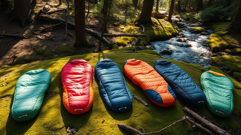Understanding temperature ratings is essential for selecting the right ultralight sleeping bag. These ratings indicate the range of temperatures in which you’ll stay warm. Comfort ratings show ideal conditions, while limit ratings reveal the lowest temperatures the bag can handle. For mild weather, look for bags with a comfort rating of 42°F to 52°F. If you’re planning for three-season use, bags rated for 32°F to 50°F are more suitable. Consider the specific temperatures you’ll face and your personal comfort preferences. Also, remember that high fill power down insulation provides an excellent warmth-to-weight ratio, while synthetic options like Thinsulate excel in damp conditions but may not compress as small. Choose wisely to guarantee a cozy night’s sleep.