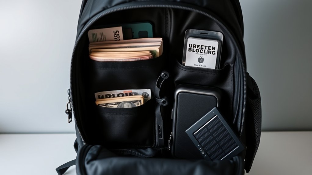 When you travel, ensuring your money is secure is essential, as it directly impacts your overall experience and peace of mind. Keeping cash and cards in separate compartments within your backpack reduces the risk of losing everything to theft. Utilizing anti-theft backpacks with lockable zippers and RFID-blocking pockets greatly enhances the security of your financial assets. Additionally, storing a small emergency stash of cash in a discreet yet accessible location can be vital when cards aren’t accepted, especially in remote areas. Regularly monitoring your cash and card balances helps you quickly detect unauthorized transactions or loss, allowing you to act promptly. Finally, having a backup plan—like storing copies of important documents and contact information for emergency card replacements—ensures you’re prepared for potential theft or loss. By prioritizing these security measures, you empower yourself to travel with confidence and freedom.