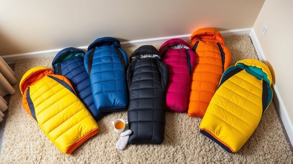 Choosing the right temperature rating for your wearable sleeping bag is essential, especially since it directly affects your comfort and warmth during outdoor adventures. Typically, temperature ratings range from 0 to 65°F (-18 to 18°C). For mild weather, aim for bags rated between 35 to 44°F (2 to 6°C). If you’re braving extreme cold, look for options rated at 0°F (-18°C) or lower. Keep in mind your personal heat retention and activity level; active users might need a higher rating, while those who get cold easily should choose lower-rated bags. Adjustable features like hoods and thermal drawcords can enhance warmth retention, making it easier to adapt to changing conditions and personal comfort needs.