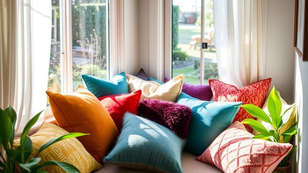 Finding the perfect window seat pillow isn’t just about size and shape; the materials used play a significant role in your comfort and the pillow’s longevity. When choosing, consider fabric types like microfiber, fleece, or velvet, as they influence both aesthetics and feel. Durability is essential; opt for high-density foam and polyester for long-lasting shape retention and resistance to wear. If you’re using the pillow outdoors, look for water-resistant or splash-proof fabrics to guard against moisture and stains. Check for reinforced stitching and quality construction to prevent deformation over time. Finally, anti-slip features, such as rubberized bottoms or ties, guarantee your pillow stays securely in place, adding to your overall satisfaction.