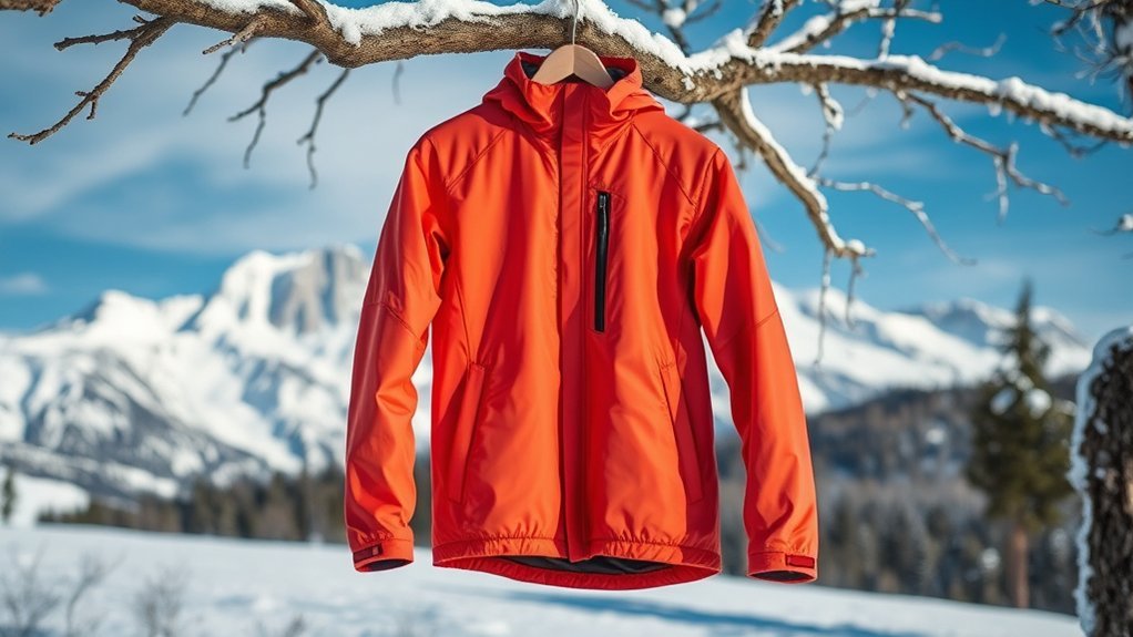 While you may focus on warmth and insulation, utility and storage options are equally important when selecting a windproof winter jacket. Look for jackets with multiple utility pockets to securely store essentials like keys, wallets, and nutrition items during your outdoor adventures. Jackets featuring both inner and outer pockets offer convenient access to your valuables while protecting them from the elements. Consider options with rear pockets for easy storage of larger items such as gloves, water bottles, or small tools—especially handy for extended excursions. Make certain the pockets have secure closures like zippers or flaps to prevent items from falling out while you’re on the move. Opt for integrated pocket designs for streamlined storage without adding bulk, enhancing comfort and mobility.