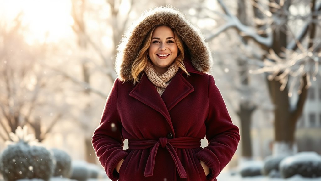 Finding the right winter jacket for plus size women means prioritizing warmth and insulation levels to keep you cozy during the cold months. Look for materials like fleece or Sherpa, which excel in warmth retention. Thicker jackets usually provide better insulation, so opt for weighty fabrics that can handle colder temperatures. A high-quality lining is essential, as it enhances warmth and comfort, preventing cold air from sneaking in. Adjustable features, such as cuffs and hems, help trap heat and minimize drafts. Finally, consider styles with hoods for that extra layer of warmth and protection against the elements. By focusing on these factors, you’ll guarantee you stay warm and comfortable all winter long.