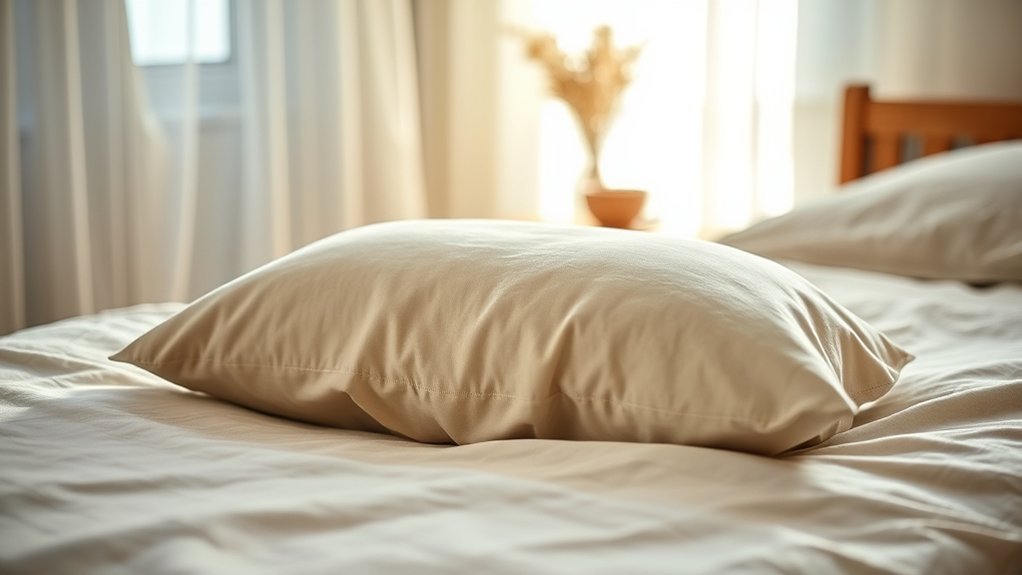 A buckwheat pillow is a supportive pillow filled with buckwheat hulls, the outer shells of buckwheat seeds, which give it a firm yet moldable structure for the head and neck. You can inspect its zippered opening and adjust the hull fill to change loft and firmness, so your sleep setup matches your body’s needs. In pillow history, this design began in Japan, where sobakawa pillows supported spinal alignment and served therapeutic use for centuries. The hulls’ natural breathability also helps manage temperature, which can improve sleep quality if you run hot at night. Because you’re choosing a durable, eco-friendly option, you may also reduce waste; with proper care, these pillows can last about 10 years. That longevity matters if you want tools that support your autonomy, comfort, and restorative rest without relying on disposable cushioning systems.