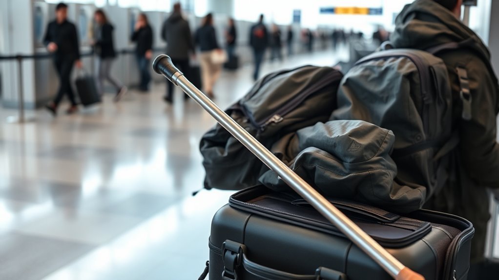 Yes, you can, if it’s a mobility aid—why let airport security block your freedom? You’ll still face metal stick regulations, screening, and airline checks, so confirm policies first and carry documentation if needed.