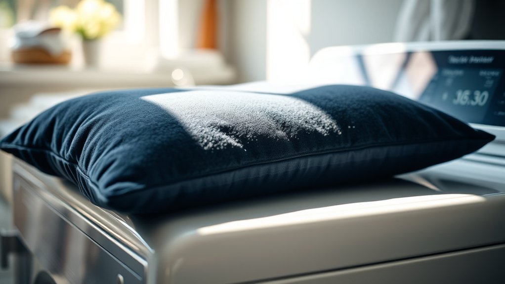 Yes, you can put a travel pillow cover in the dryer, but you need to follow careful guidelines. Always check the care label first. Use low heat settings to prevent damage and avoid high heat, which can warp or melt synthetic materials. Secure any zippers or fastenings to prevent snagging during the drying process. If you’re unsure about dryer safety, air drying is a great alternative to keep your cover in top shape. There’s more to know about proper care and maintenance!