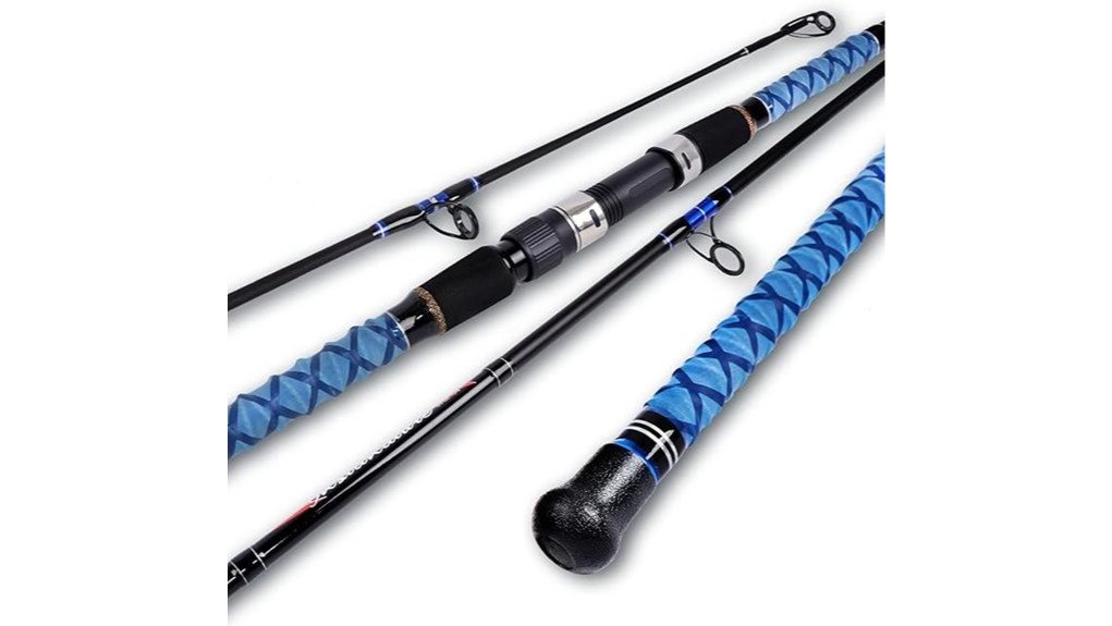 Ideal for surf fishing, the rod specifications suggest targeting species like striped bass and bluefish, akin to a skilled dancer maneuvering through waves. Its design guarantees responsiveness and strength, enhancing the angler’s connection with the aquatic domain.