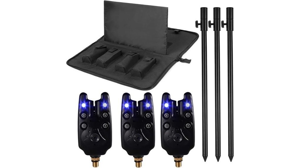 The LSOSVSEU Fishing Bite Alarm Indicator Set is a reliable choice for anglers. It includes three high-quality LED alarms, adjustable sensitivity, and loud sound and flash notifications for detecting bites. The set comes with extendable aluminum banksticks, ranging from 30cm to 50cm, and a compact, waterproof tool bag for easy transport. Users appreciate its performance across various fishing conditions. For a deeper investigation into its features and user experiences, further details await exploration.