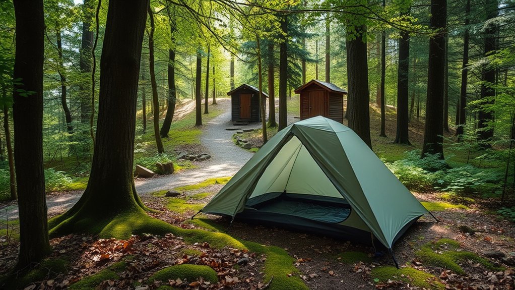 When camping, pitch your tent at least 100 feet from bathrooms to avoid unpleasant odors and germs, and aim for a 200-foot distance from trails to guarantee privacy and tranquility. This keeps you comfortable while minimizing disturbances to local wildlife and ecosystems. Following these guidelines not only enhances your camping experience but also supports the environment. Stick around to uncover more tips on choosing the perfect campsite!
