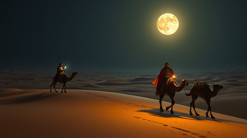 You’d estimate the Magi’s journey took about two years, from star-sighting to Jerusalem. Their Magi’s route likely stretched from Persia, and Travel challenges like desert crossings, border tensions, and caravan pace slowed them considerably.