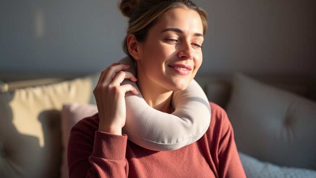 To maximize comfort during your travels, positioning your travel pillow correctly is essential. Start by ensuring it cradles your neck snugly, with minimal space between the pillow and your shoulders for ideal support. Align the back of the pillow with the base of your skull to maintain a neutral head position and reduce strain on your cervical spine. For side sleepers, adjust the pillow to bridge the gap between your neck and shoulder, keeping your head aligned with your spine. If you’re using a U-shaped pillow, make sure the indent rests comfortably under your chin. Always test its position while seated; a well-fitted pillow should provide travel comfort, allowing your neck and shoulders to relax.