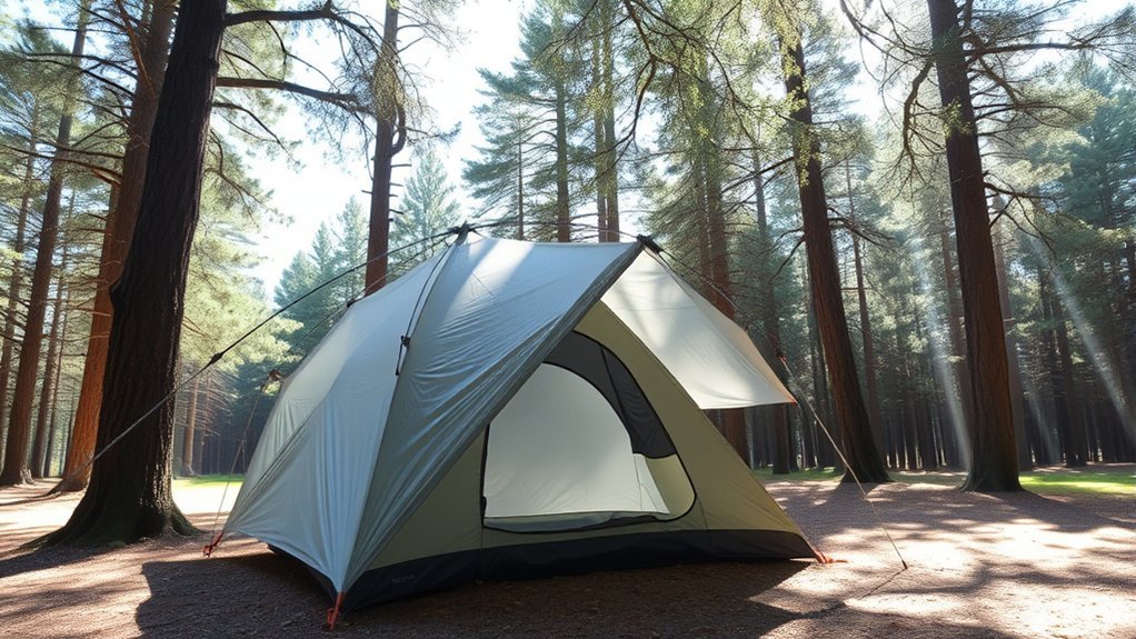 Regularly check the tension of all lines, especially after heavy rain. This vigilance guarantees your shelter remains secure and effective throughout your camping experience. With these steps, you can enjoy nature’s freedom without worrying about unexpected downpours.