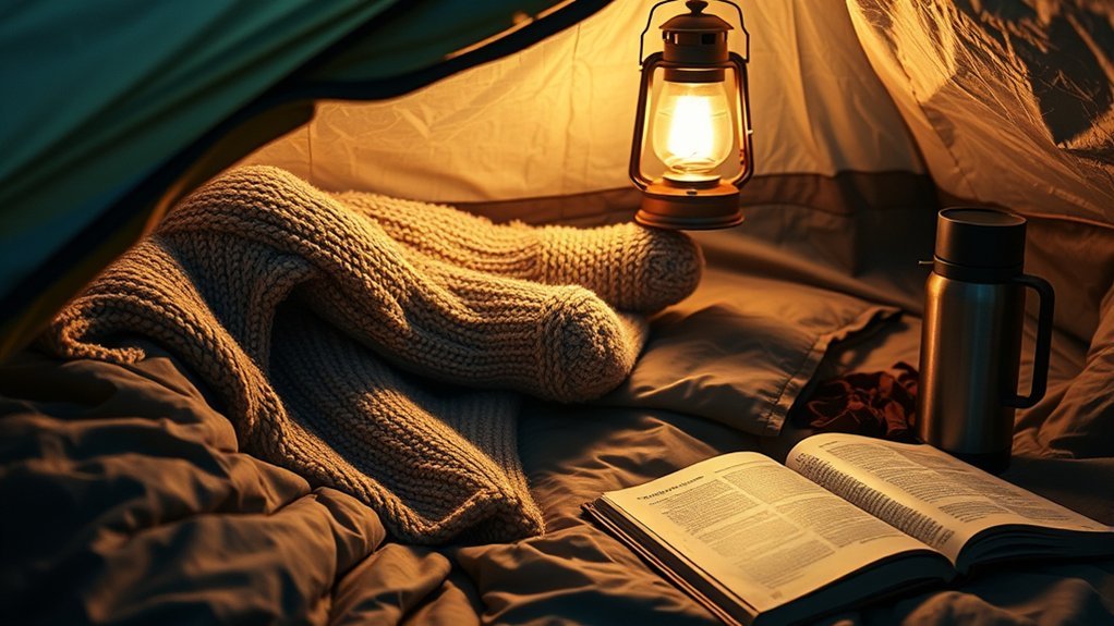 To keep your feet warm while sleeping in a tent, switch to dry, moisture-wicking socks before bed to prevent heat loss. Do some light exercises like wiggling your toes or jogging in place to boost circulation. Consider using insulated booties with hybrid fill for effective warmth. For added comfort, you can place a leak-proof warm water bottle at the foot of your sleeping bag. Discover more tips to enhance your warmth throughout the night.