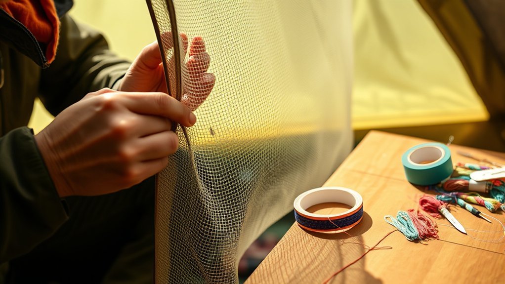 To repair tent mesh, start by identifying any holes and bunched fibers. For small holes under 3 inches, use tenacious tape mesh patches, ensuring the area is clean and dry first. Larger holes need fabric patches at least half an inch larger, applied on both sides for extra durability. Use strong, UV-resistant thread for sewing, opting for straight or zigzag stitches. Regular inspections and maintenance are key to preventing further damage. There’s more to know to keep your tent in top shape.
