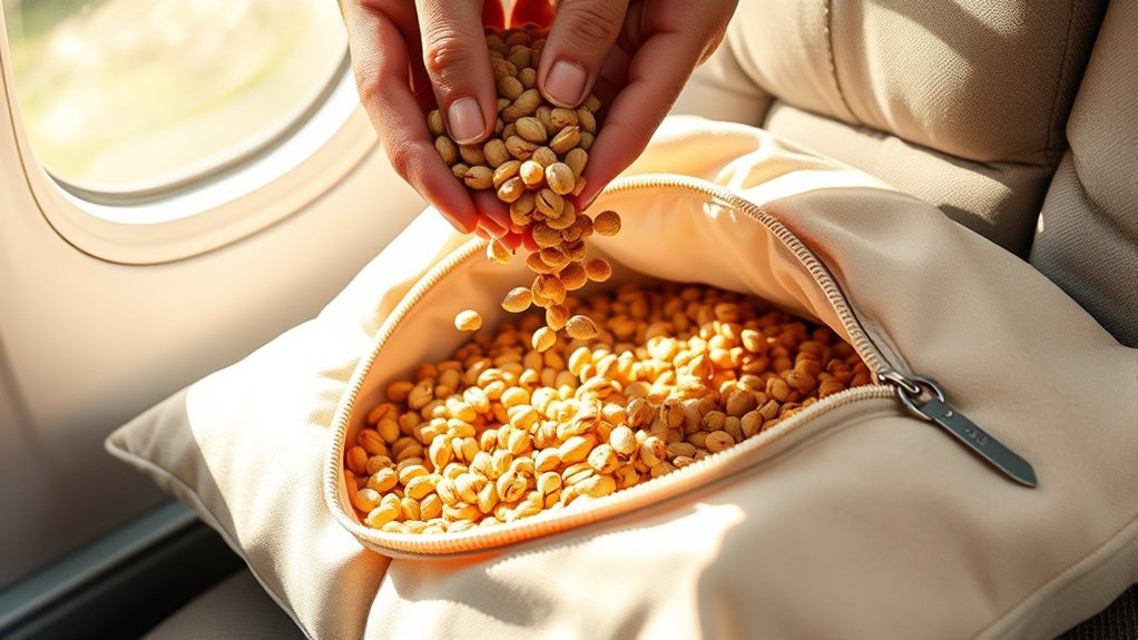 To access and empty your travel pillow of buckwheat hulls, start by locating the invisible zipper on the exterior cover, which provides easy entry to the filling compartment. Gently open the zipper in a clean area to prevent losing any hulls. Carefully pour out the buckwheat hulls into a container or bag for replacement or disposal, taking care not to spill them. If needed, use a funnel to assist in pouring new buckwheat hulls back into the pillow after emptying it. For effective pillow maintenance, make sure you securely close the zipper after refilling. This zipper care is vital as it keeps the hulls inside, guaranteeing your pillow maintains its shape and provides the support you need for restful travel.