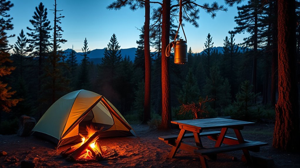 To store food while tent camping and avoid attracting animals, know your local wildlife and their behaviors. Use a bear-resistant canister for backpacking, and for car camping, invest in a bear-proof cooler. Hang your food securely at least 15 feet off the ground, 100 feet from your tent. Combine these precautions with bear spray for added safety. Keeping your campground clean and securing trash is also essential. Learn more about effective techniques to keep your food safe.