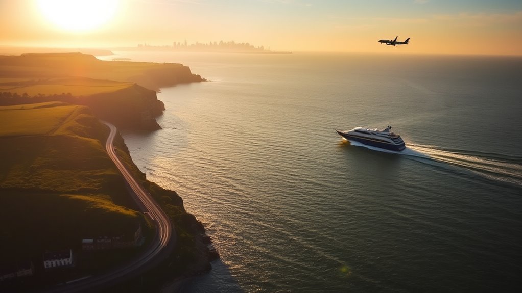 Yes, you can take a ferry from Normandy to England. You’ve got ferry options from Caen or Cherbourg to Portsmouth, with scenic crossings and onboard comforts; book ahead for better fares and smarter travel tips.