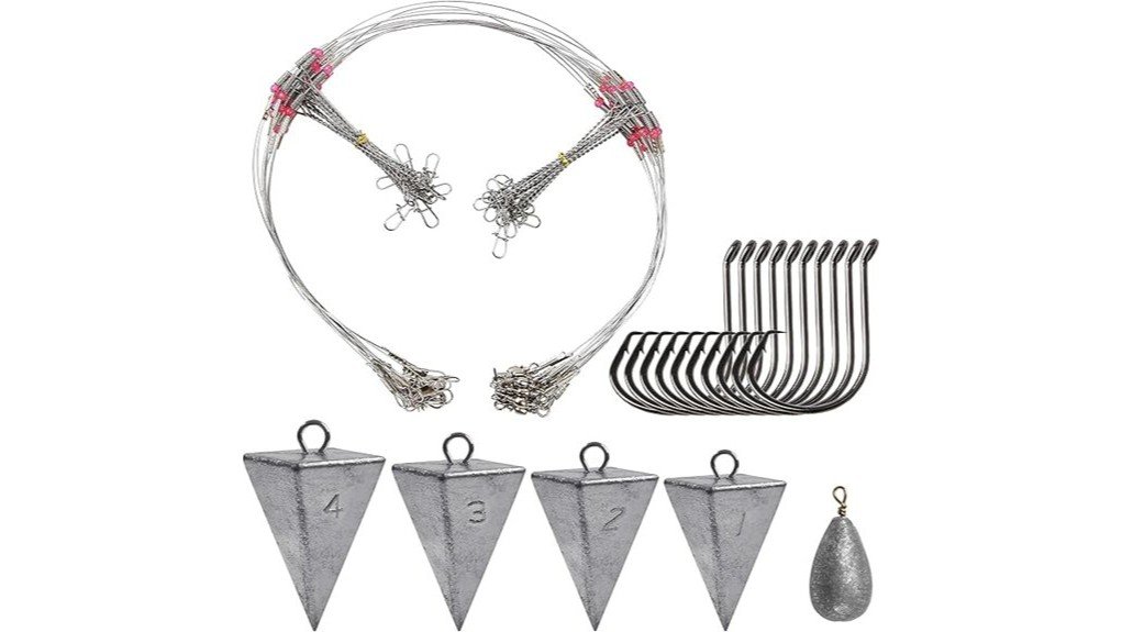 This all-encompassing kit includes essential tackle components: 12 fishing leaders, 4 pyramid sinkers (ranging from 1 to 4 oz), 1 bass casting sinker, and 10 circle hooks.