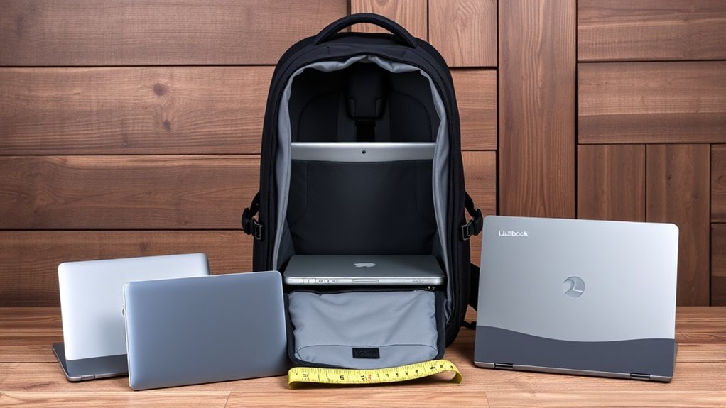 Choosing the right travel backpack for your laptop starts with understanding sizes. Measure your laptop diagonally, excluding the bezels, to guarantee it fits snugly. Opt for a 15-inch backpack for laptops up to 15.6 inches, or go for a 17-inch for larger models. Look for padded sleeves, water-resistant materials, and additional organizational features. These not only protect your device but also enhance travel convenience. Stick with us to discover more tips and insights for your perfect backpack!