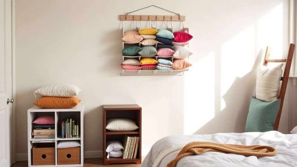 - Regularly inspect stored pillows for cleanliness and condition to guarantee they’re in good shape.