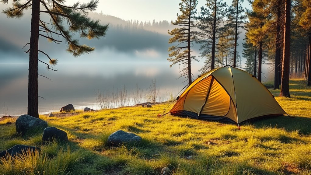 You should camp at least 61 meters, or 200 feet, from lakes, streams, and other water sources. This buffer helps protect water quality, reduce erosion, and limit wildlife disturbance. In dry or sensitive areas, you may need to stay even farther away, depending on local rules. Keep tents spaced about 10 to 25 feet apart for comfort and safety. If you want to plan smarter, there’s more to know.